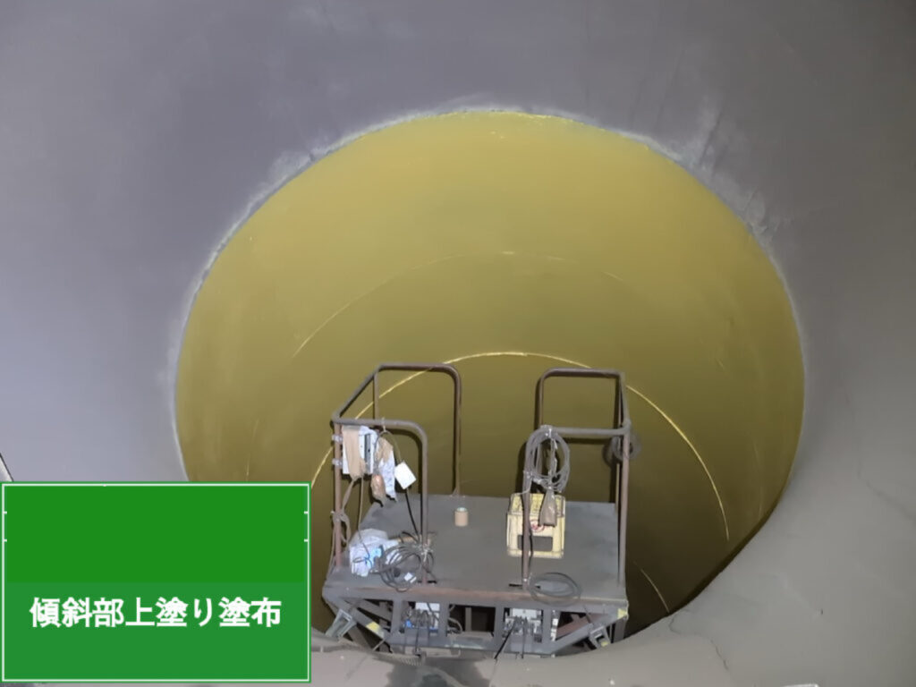 傾斜部や水平部など形状が複雑な箇所にも丁寧に塗布し、水流に負けない強固な塗膜を形成しました。静岡のダム施設を長期間安全に使用するための大切な工程です。